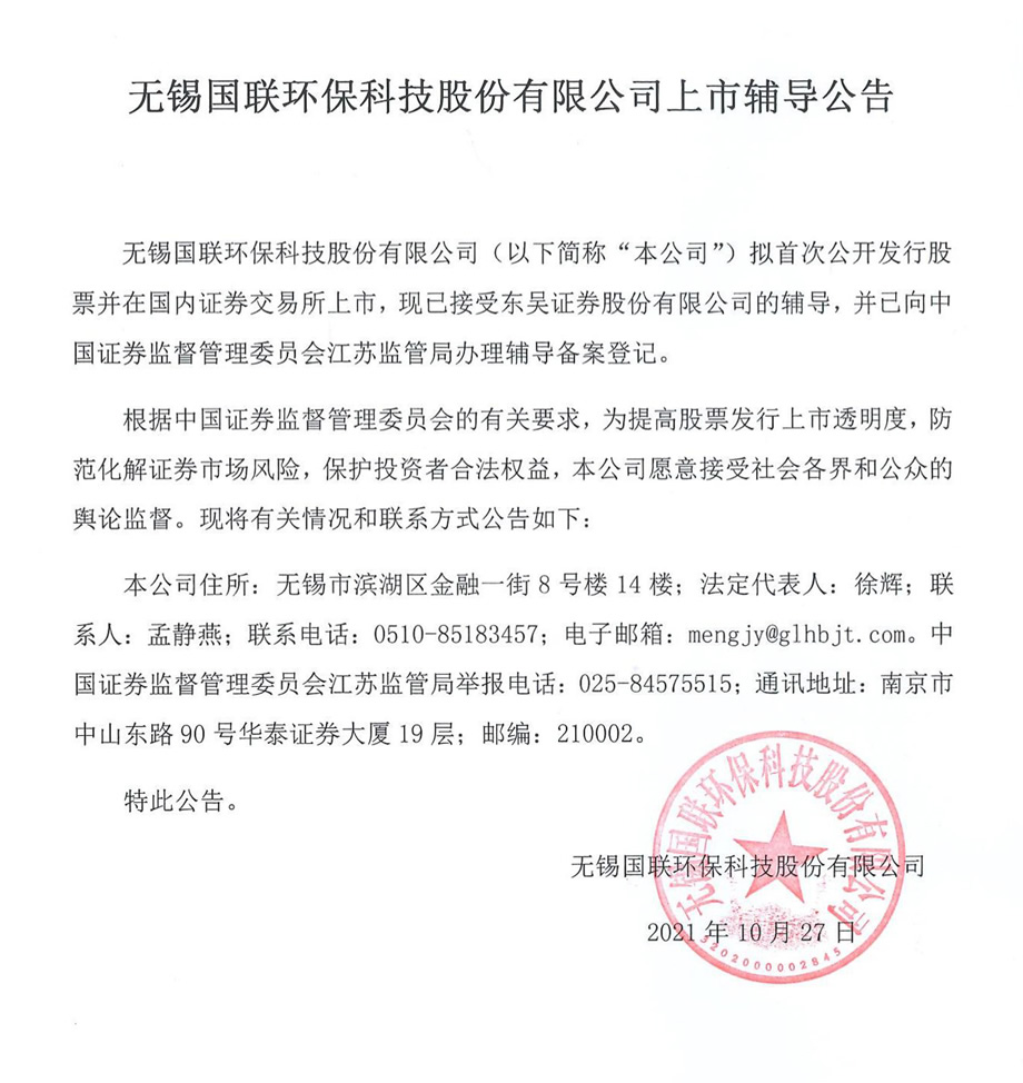 無錫國聯環??萍脊煞萦邢薰旧鲜休o導公告